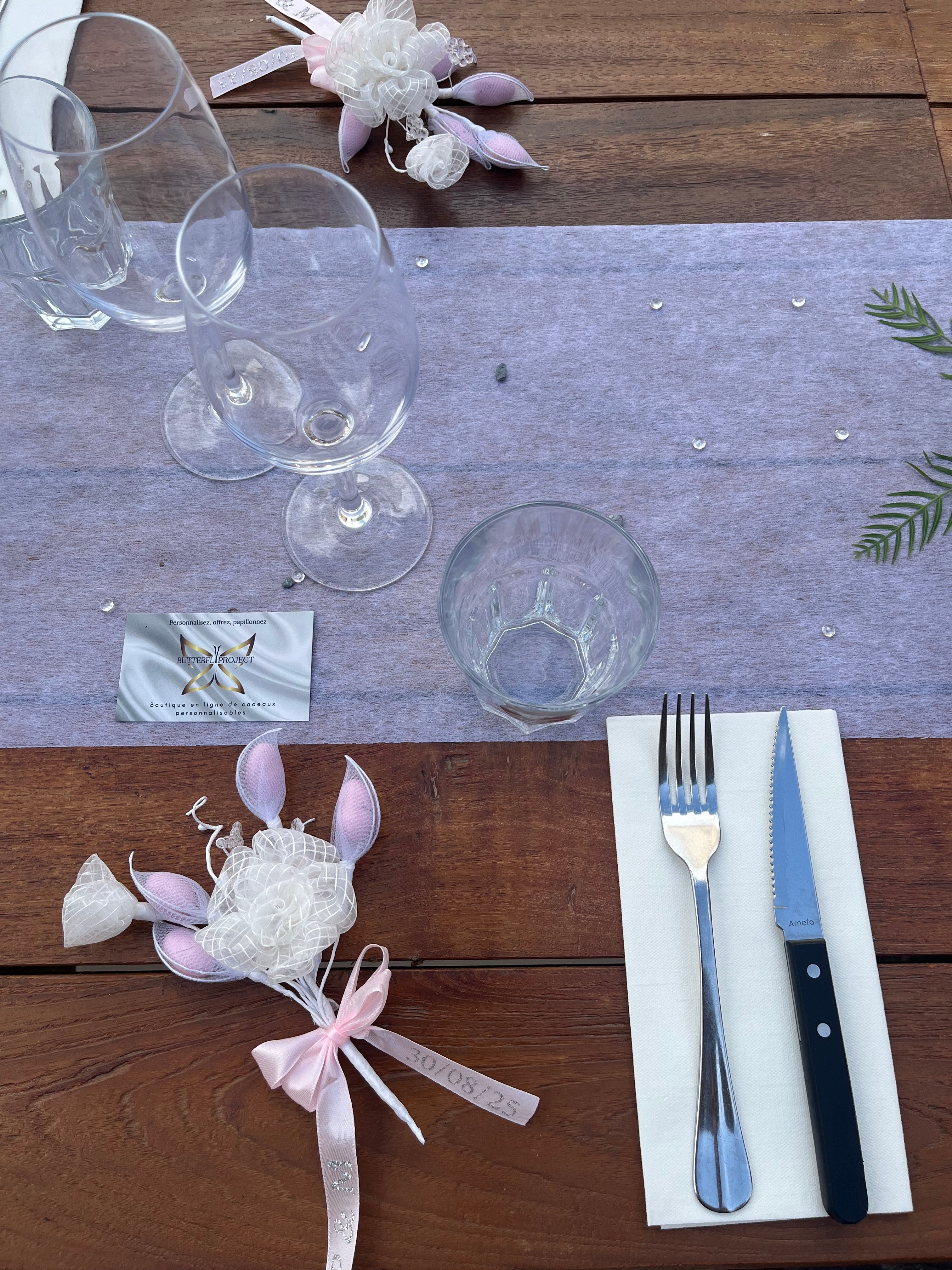 "Nous avons offert aux futurs mariés ce cadeau personnalisé. La table était sublimée par leurs jolies fleurs et les nœuds personnalisés. Merci infiniment, le rendu est magnifique et tous les invités ont été conquis !"